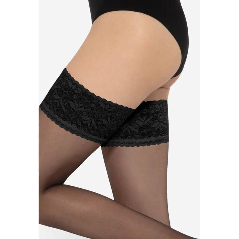 A női önhordó harisnyanadrág fonott Lycra fonalból, matt, átlátszó, kiváló minőségű csipkéből készült, a combban rögzített szilikoncsíkokkal.