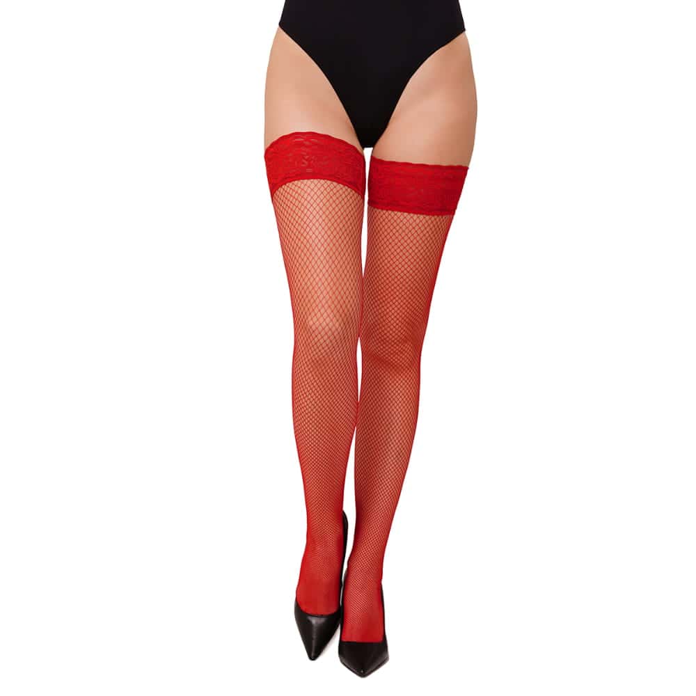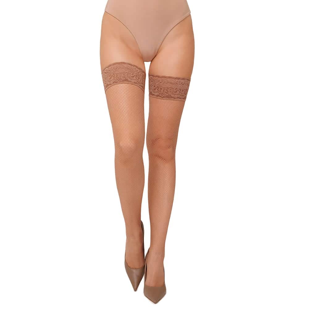 Eleganckie damskie pończochy samonośne wykonane z delikatnego siateczkowego materiału, wykończone efektowną koronką i silikonowymi paskami zapewniającymi doskonałe trzymanie na nogach.
