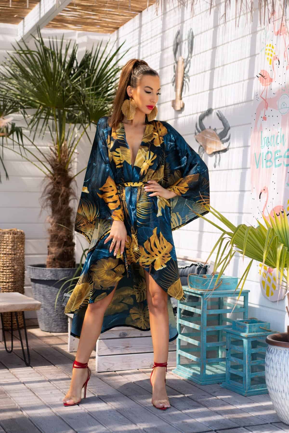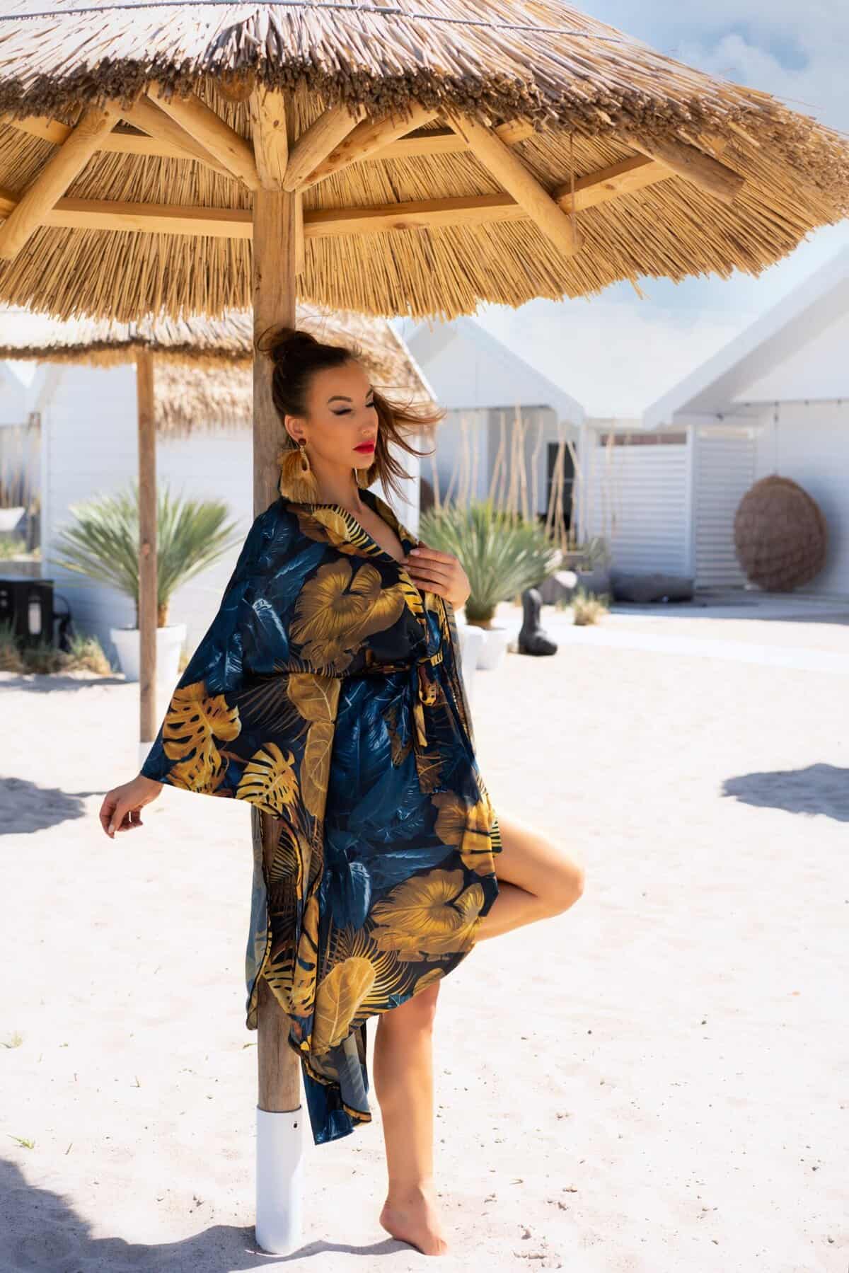 Župan Handis je kombináciou jemnej zmyselnosti so štýlovou originalitou. Župan, zaviazaný v páse hrubou šerpou, bol ušitý z vzdušnej látky, ktorá pekne prilieha k telu. Mäkký a príjemný materiál na dotyk je zároveň veľmi vzdušný, vďaka čomu oblečenie vyzerá dobre aj na pohybe. Tmavomodrý materiál bol zdobený originálnym vzorom s kvetinovými motívmi – zelená veľkých listov bola prelomená jemnou ružovou kvetov, čím vznikol tropický vzor – vďaka čomu môže župan slúžiť aj ako plážový doplnok. Okraje látky boli chránené proti roztrhnutiu omotaním a podšívkou materiálu, čo umožnilo elegantný vzhľad. Obálkový strih županu umožňuje jednoduché nastavenie hĺbky výstrihu, vďaka čomu sa župan stáva doplnkom vhodným ako na vášnivé večery, tak aj na lenivé rána. Pohodlné, široké rukávy neobmedzujú pohyb, čo poskytuje pohodlie a slobodu nosenia. Župan vyzerá dobre na každom type siluety, pretože bol navrhnutý tak, aby zakryl nedokonalosti a odhalil prednosti postavy.