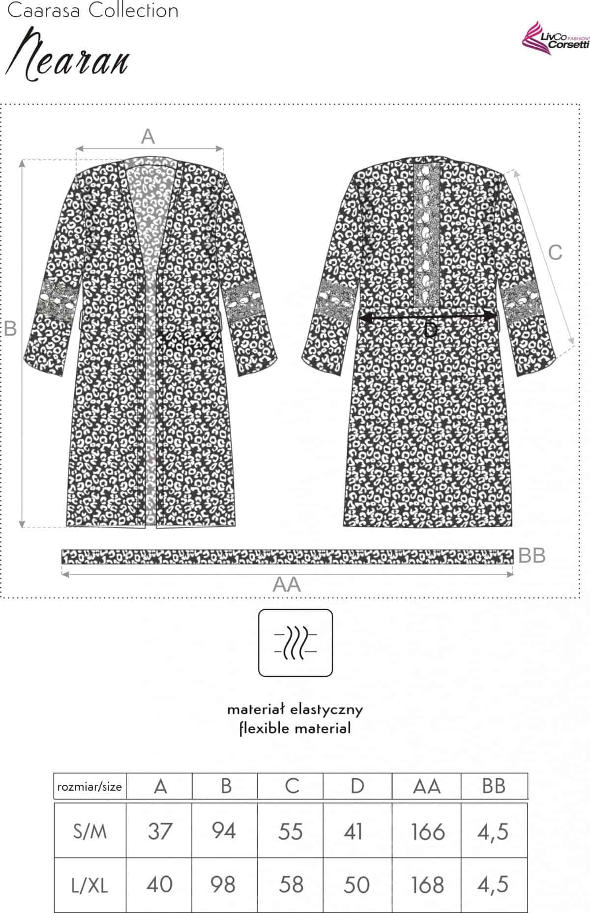 Župan Nearan z kolekcie Caarasa je jedinečný model pre každú ženu bez ohľadu na vek. Praktická kombinácia bielej a čiernej farby v zaujímavom vzore dodáva županu originálny vzhľad. Zdôrazňuje ženský štýl a vyniká z okolia. Je to kombinácia pohodlného poťahu s nádychom sexepílu a zmyselnosti. Doplnkové dekorácie v podobe čipky vo výške lakťov a chrbta budú perfektné pre ženy, ktoré uprednostňujú elegantný, ale aj boho štýl. Dĺžka rukávov poskytuje ochranu pred chladnými ránami a večermi. Dĺžka po kolená zase poskytuje pohodlie a zároveň umožňuje odhaliť nohy. Župan Nearan sa vďaka univerzálnosti strihu môže nosiť voľne alebo sa môže zaviazať opaskom, aby sa zdôraznil pás. Župan Nearan je vyrobený z príjemného, ​​na dotyk príjemného materiálu, ktorý je šetrný k pokožke. Vďaka kvalitným tkaninám je odolný voči vonkajšiemu poškodeniu. Je dostupný vo veľkostiach S/M a L/XL, vďaka čomu sa ľahko prispôsobí každej postave.